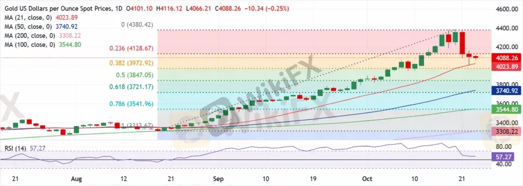 不过,他们必须重新夺回 23.6% 斐波那契回调位(8 月 19 日低点至 10 月 20 日高点),即 $4,129 的支撑位转阻力位,才能重振创纪录的涨势。下一个顶部障碍是 $4,300 整数关口,然后是历史高点 $4,382 关口。
