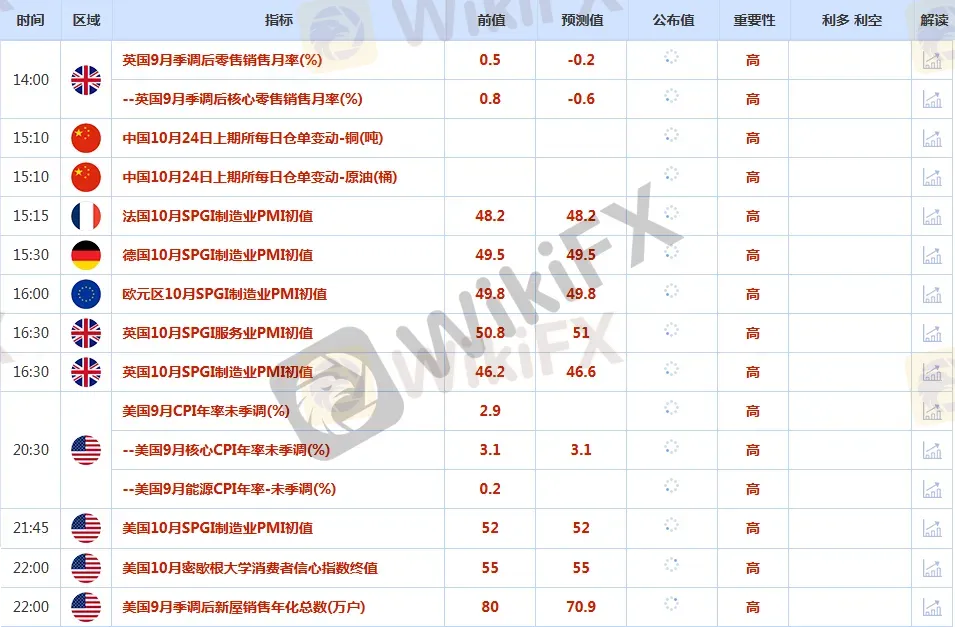 摘要:CWG Markets市场资讯2025年10月24日(周五):汇讯摘要:周四,投资者等待美国消费者物价指数的发布,美元指数维持震荡,在触及99关口后回落,最终收涨0.06%,报98.94。基准的10年期美债收益率最终收报4.005%,对美联储政策利率敏感的2年期美债收益率收报3.5010%。本周,金价在经历短暂回调后迅速反弹,站稳4100美元上方,周四(10月23日)盘中一度攀升1.37%至415
