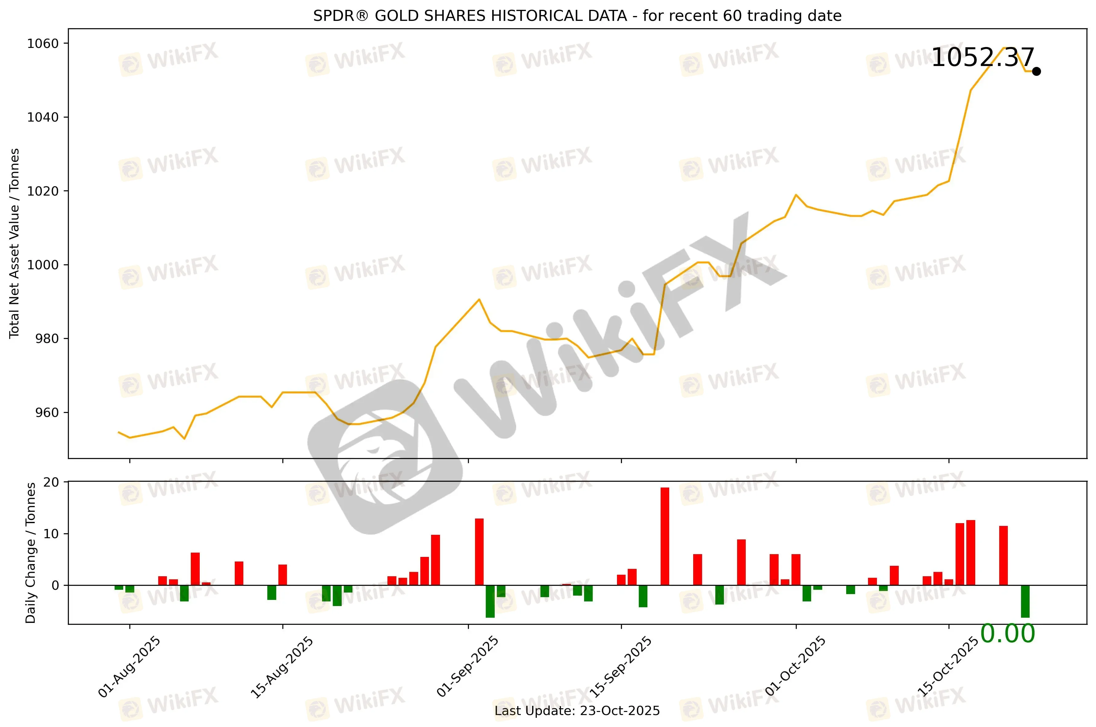截至10月23日,全球最大的黄金ETF SPDR Gold Trust持仓量为1052.37吨,与上一个交易日持平。10月23日现货黄金整体为先震荡上行、后高位回落的波段结构。亚盘开盘后在4070-4100美元区间震荡,最低向下触及4066.17美元/盎司,欧盘盘前突破并站稳4100美元关口,美盘交易时间拉升至当日高点4154.79美元/盎司后有所回落。最终收于4126.119美元/盎司,涨28.179美元或0.69%。