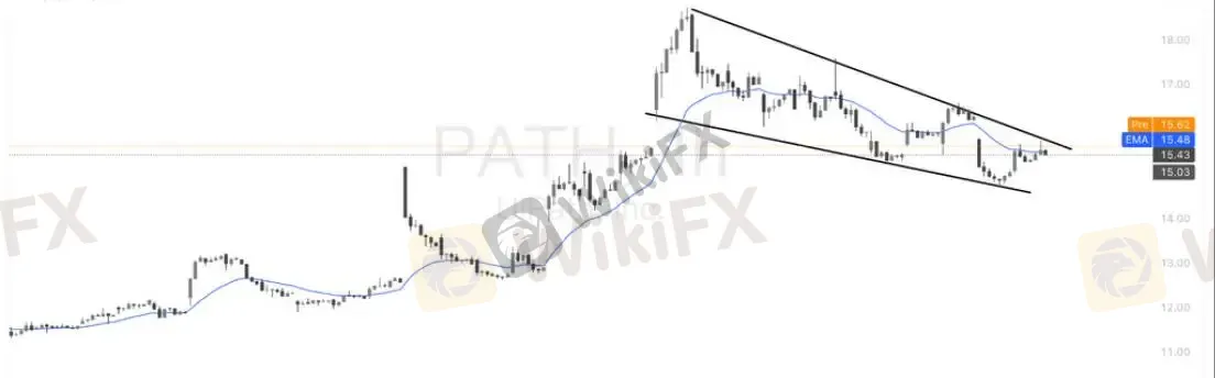 技术面来看,PATH目前处于下行收敛楔形结构内整理,短线价格在20EMA附近震荡企稳。若后续突破昨日高点并站稳15.8美元上方,将确认反弹趋势启动,目标或指向前高18美元附近;反之若跌破15美元支撑,则短线仍有回踩风险。整体结构显示,多头正在积蓄力量,关注突破信号。