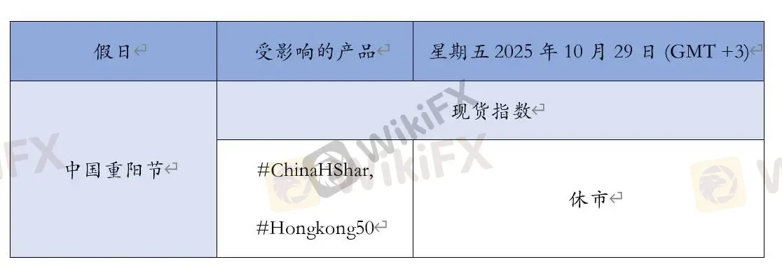 温馨的提示您,2025年10月29日中国重阳假日期间,部分产品的交易时间有所变动,请查看下表了解受影响的产品。