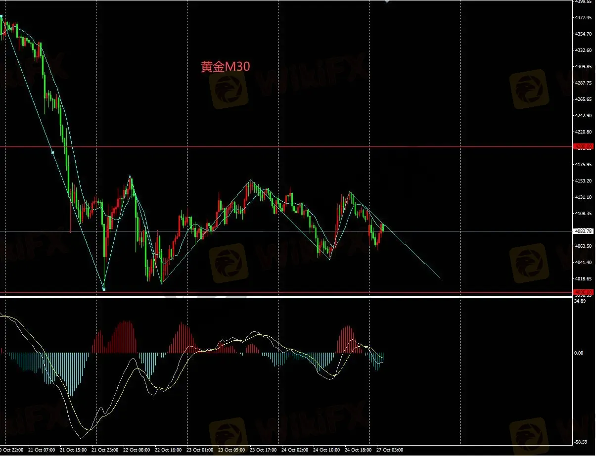 上周金价创10周来首跌,多头获利了结迹象明显。目前市场贸易紧张局势缓和,10月26日中美经贸团队在马来西亚首都吉隆坡结束了为其两天的贸易磋商。会后美国财长被森特在接受媒体采访时,表示双方达成了“非常实质性的框架协议”,美方不再考虑对中方加征100%关税。尽管贸易局势缓和但上周五美国公布通胀数据略低于预期,强化了美联储本周四凌晨降息的可能性。