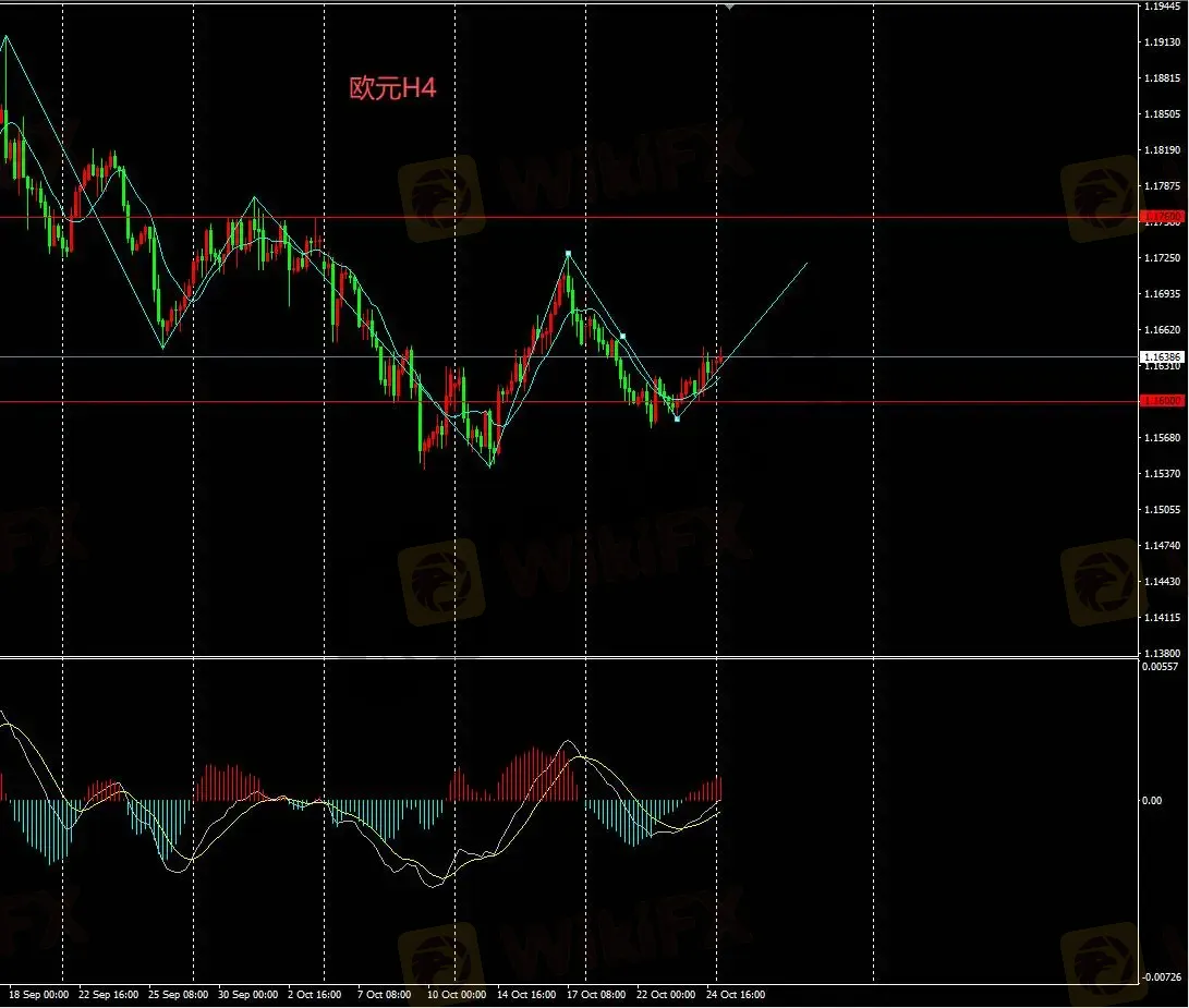 H4图表价格短期站上1.16关口,短期看多,目标1.17。