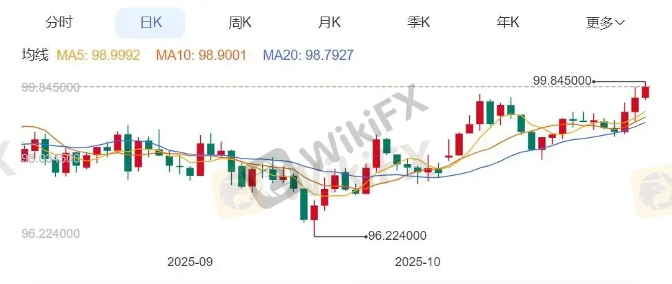 受货币政策预期差的影响,美元指数10月31日上涨0.35%,至99.82,月度涨幅达到2%,为7月以来最佳表现。分析人士预期美元指数将在约102的技术阻力位下方盘整,并在明年经济增长可能加速的情况下走强。