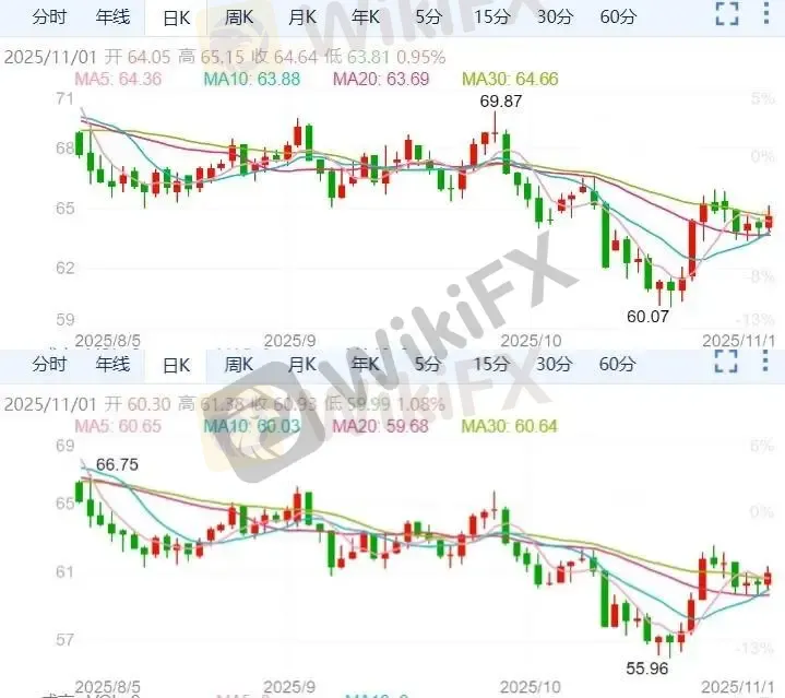 10月31日油价小幅收高,盘中因突发地缘政治消息剧烈波动。布伦特原油期货最终报收于每桶64.64美元,上涨近1%%;美国原油期货收于每桶60.88美元,上涨近1%。市场情绪受到一则关于美国可能对委内瑞拉发动空袭的报道显著影响,油价随之快速冲高,但在美国总统特朗普公开否认该计划后涨幅收窄。