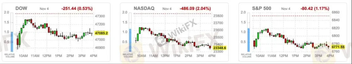 风险情绪在周一延续下滑。继美联储官员发表鹰派言论后,市场对短期降息的预期迅速降温;美股期货自亚洲盘起走弱,开盘后持续承压。AI板块成为卖压核心,Palantir(PLTR)财报虽优于预期但因估值压力重挫逾9%,引发市场对AI与半导体族群估值过高的担忧。避险情绪升温,VIX盘中暴涨逾19%,纳指下跌2.04%,费半更重挫4.01%,四大指数全线收黑。