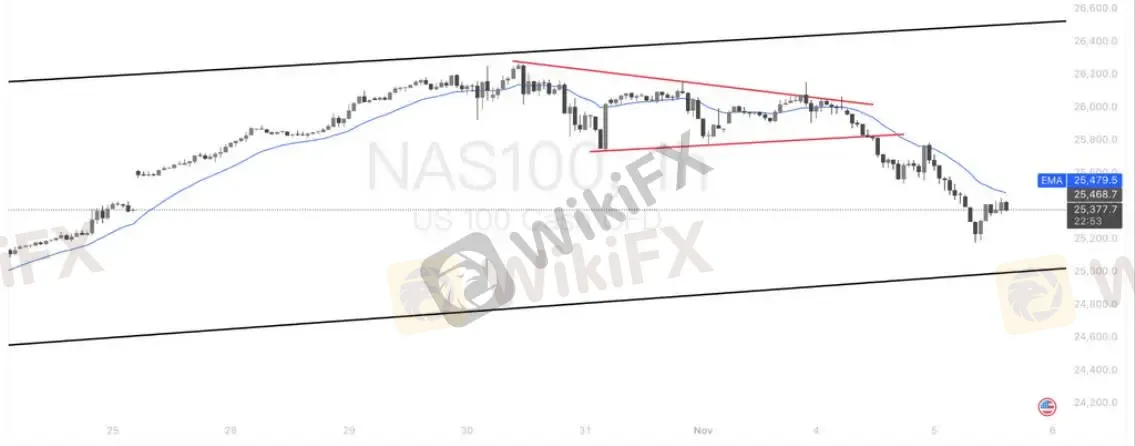 纳斯达克100指数在经历连续上涨后,于高位形成收敛三角形(红线),随后向下跌破支撑并持续走弱。目前价格运行在20周期EMA(蓝线)下方,显示短线动能仍偏空。若无法有效收复25,480一线,空方压力将维持,指数有机会进一步回测下方趋势通道支撑约25,000点区域。短期关注反弹乏力后的再度下探机会,除非强势突破EMA并重新站稳25,600上方,否则趋势偏弱格局不变。