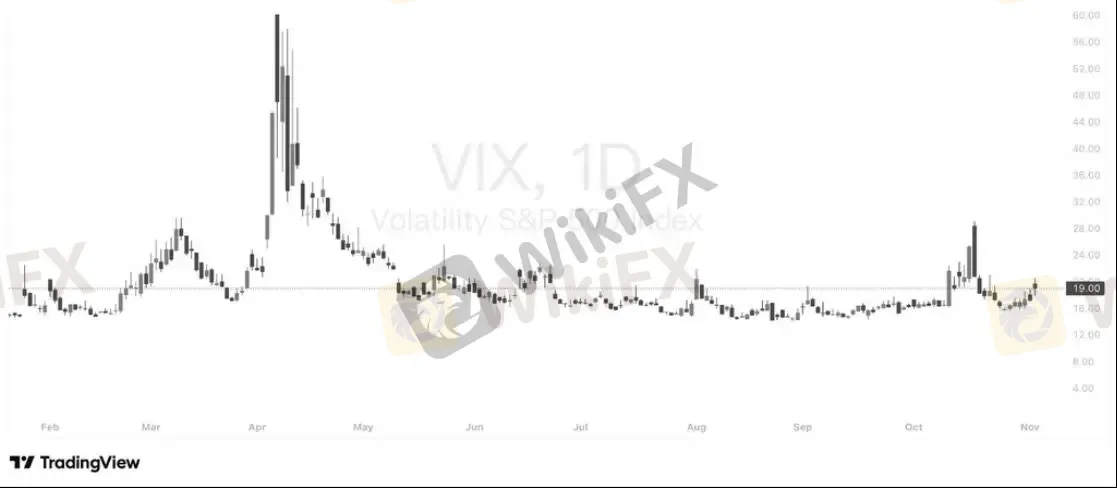 尽管全球股市出现明显回调,VIX指数仅小幅反弹约10%,至19附近,显示市场整体避险情绪依然温和。相较于4月与10月高波动时期的急剧飙升,本轮波动率反应明显偏弱,反映出投资人对风险事件的预期可控,以及系统性抛售情绪尚未形成。若VIX持续受限于20以下区间,意味着当前下跌或仍属技术性调整,而非恐慌性抛售。但若后续突破22–24区间,才可能引发更深层的避险浪潮。