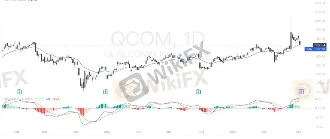 技术面上,高通(QCOM)股价近期呈现震荡上行趋势,自年初以来经历了一轮深幅回调后逐步企稳反弹,当前价格在172美元附近运行,短期均线(如20日EMA)呈多头排列,显示上涨动能仍在延续。MACD指标金叉且柱状体转正,反映市场买盘力量增强,技术面整体偏强。尽管近日出现小幅回落,但未跌破关键支撑位,若后续能站稳170美元上方并放量突破前高,则有望开启新一轮上涨行情。