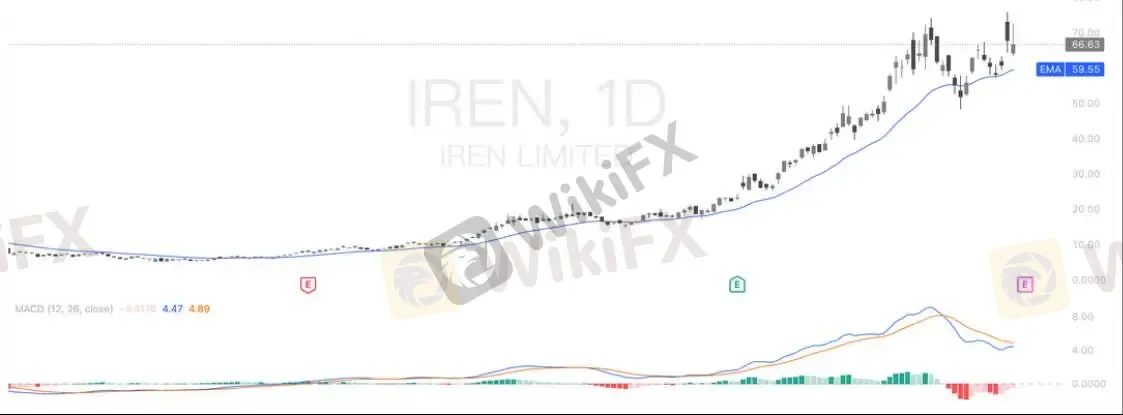从日线图来看,IREN股价自2024年中启动强劲上升趋势,突破前期盘整区间后持续上行,近期在70美元附近遇阻回落,当前收于66.63美元,小幅回调但未跌破关键支撑。MACD指标虽出现红柱缩短、快慢线有收敛迹象,但仍处于零轴上方,显示买方动能尚未完全衰竭。整体技术结构显示,股价在经历快速上涨后进入阶段性整理,若能稳守59.55美元以上支撑位并重新站上70美元,则有望延续升势;反之,若有效跌破59.55或形成双顶形态,则需警惕回调风险。