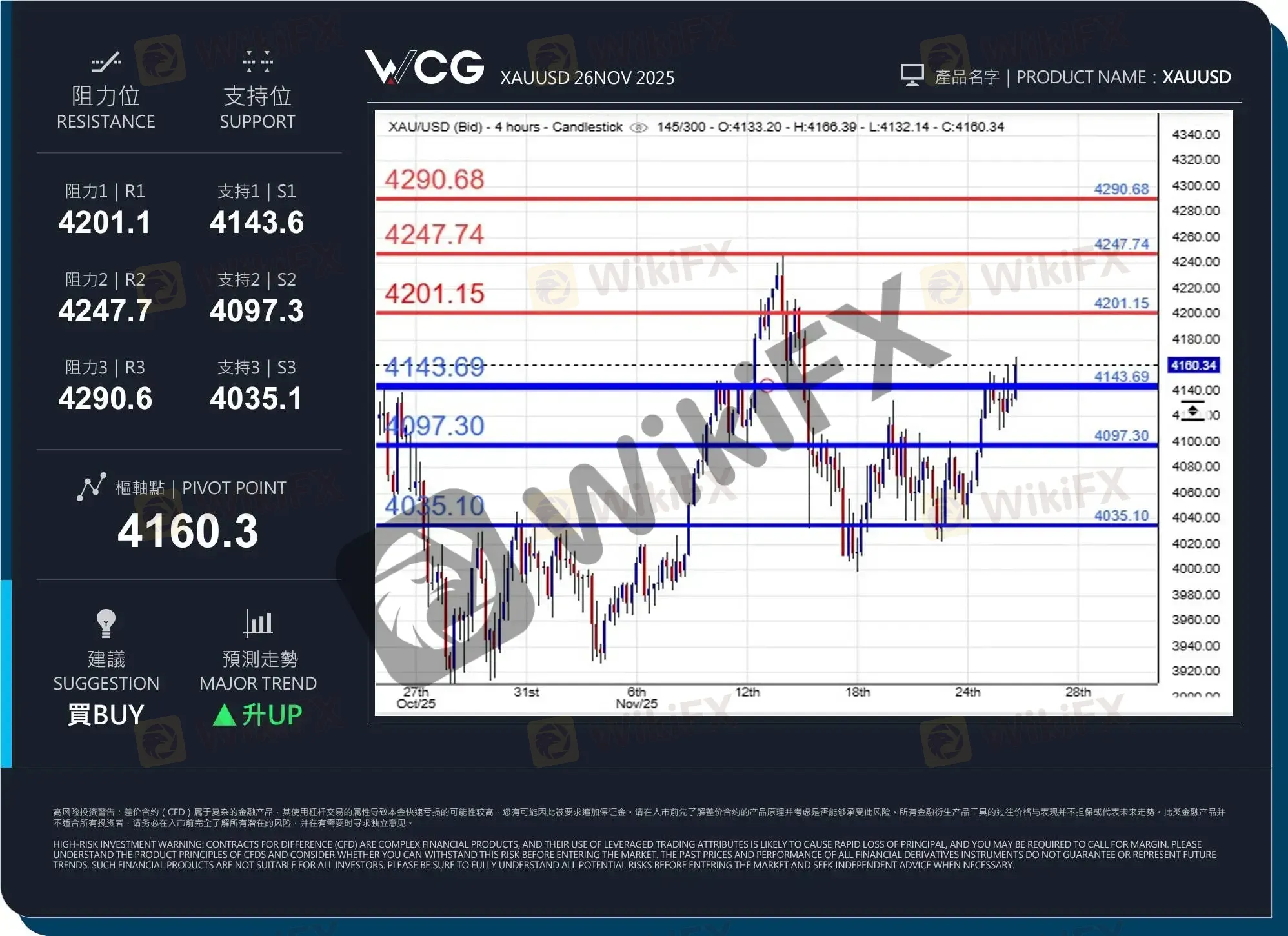 摘要:WCG Markets2025年11月26日黄金市况分析【XAUUSD 日内分析】日期:2025年11月26日(星期三)时段:亚洲盘 欧洲盘大方向判断今日整体方向:偏多(震荡上行,测试前高压力)主要逻辑:基本面:市场观望美联储表态及美国11月数据,短线避险资金有支撑。技术面:价格在短期均线上方,K线呈震荡上行,波动收缩等待突破。关键价位(支持 / 阻力)支持位:S1 = 4035.1S2 = 4