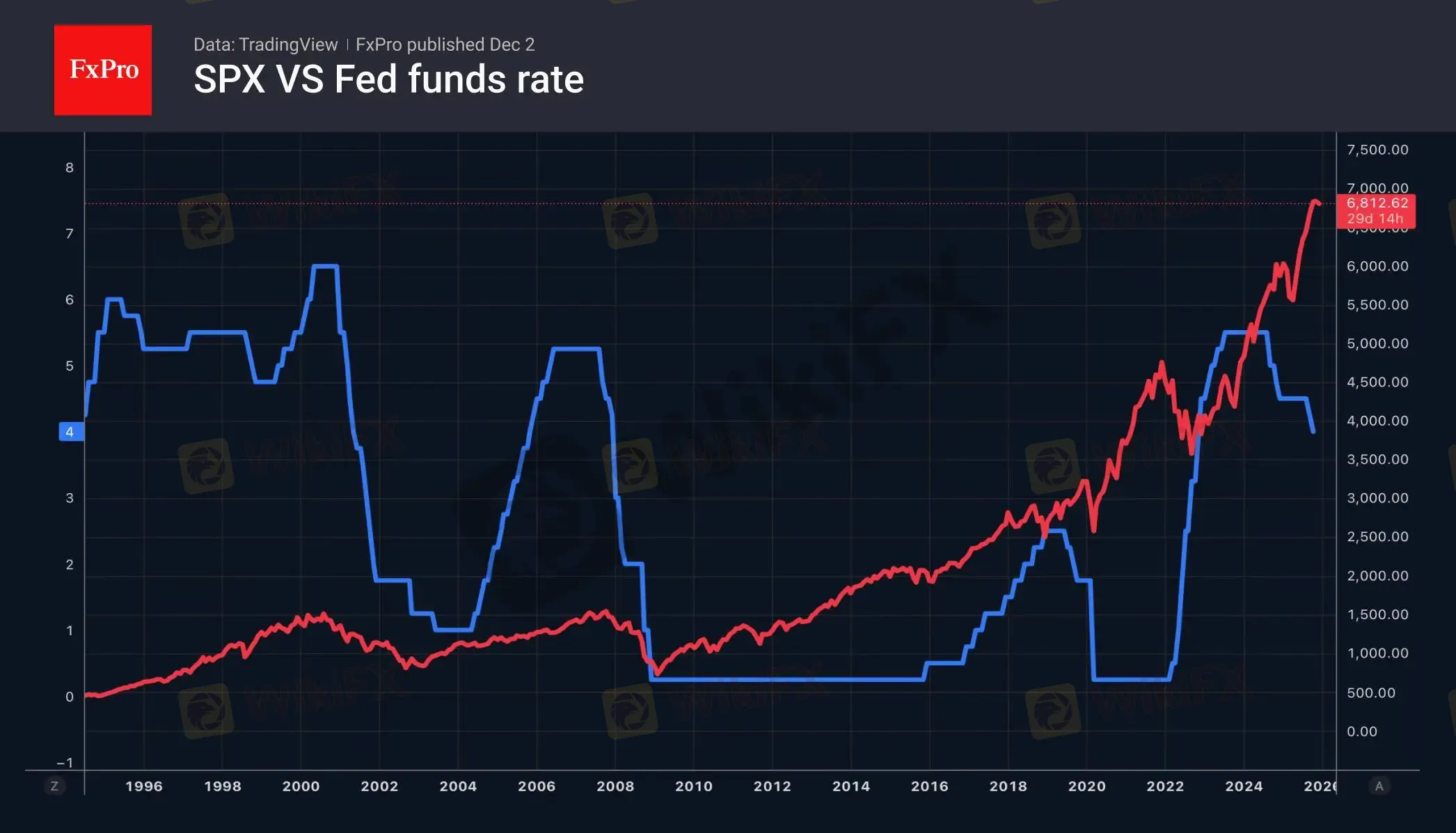 当市场正为圣诞行情蓄势待发,且预期联邦基金利率将下调时,多头力量难以阻挡。据美国银行(Bank of America)预测,美联储预计将在2025年放松一次货币政策,并在2026年再放松两次。这一预测是基于联邦公开市场委员会(FOMC)成员的变动,而非美国经济状况。迄今为止,经济健康状况一直对标普500指数构成支撑。当前的经济形势允许利率下调,但尚未引发对经济衰退的担忧。