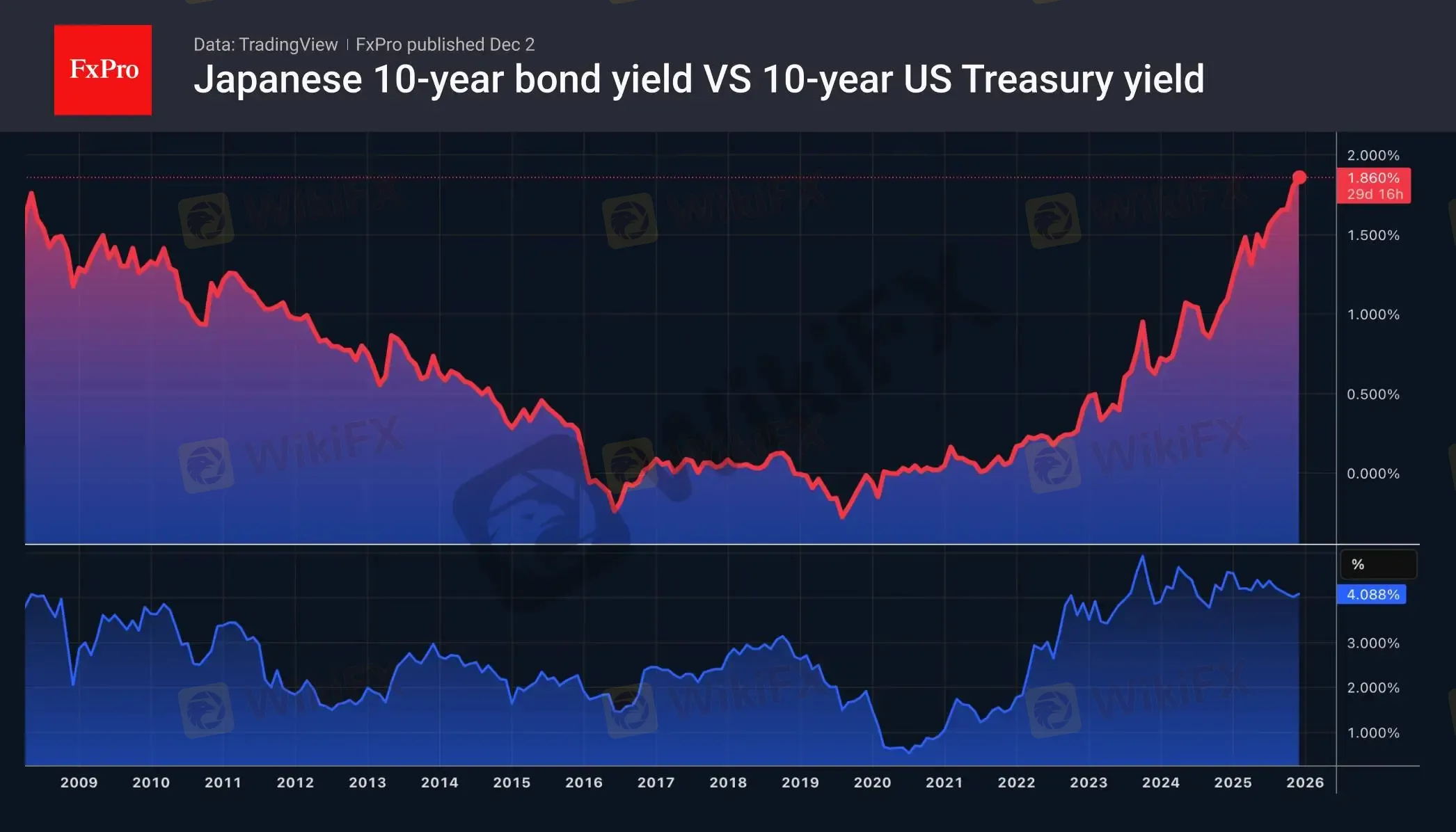 欧元兑美元(EURUSD)这一主要货币对从两周高点回落,核心原因是 10 年期美国国债收益率反弹至 4% 上方。投资者担忧,持有 1.2 万亿美元美国国债的日本,随着本土资产吸引力提升及资金回流,可能启动大规模美债抛售。而日本央行行长植田和男近期释放的鹰派信号,进一步强化了市场对 12 月加息的预期,这一预期成为美债抛售担忧的重要支撑。连锁反应下,10 年期日本国债收益率已飙升至 2008 年金融危机以来的最高水平,日元资产吸引力持续增强。