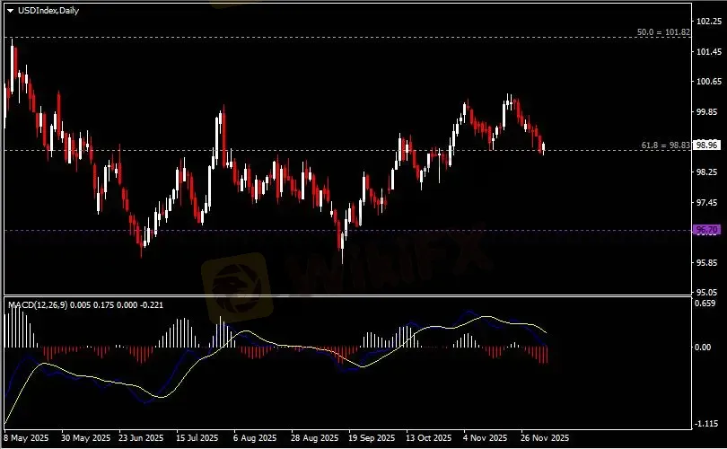日线图显示美元指数企稳收涨于98.80支撑。从MACD来看,快慢线向下运行,红色动能柱略呈收缩。指数走势基本和动能柱的变化一致。