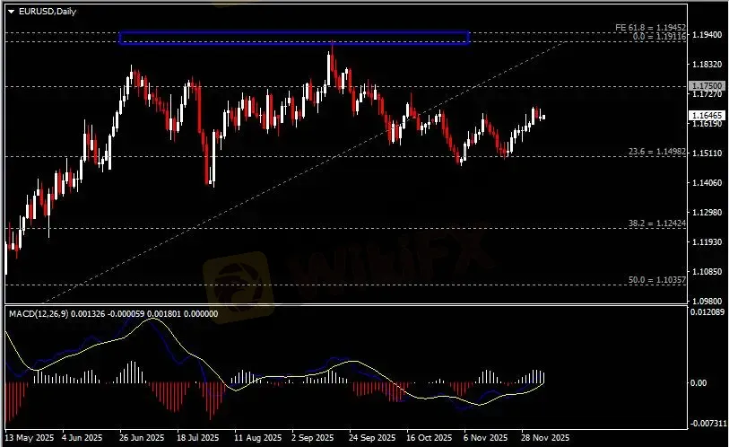 日线图显示欧元兑美元回调下跌,当前仍企稳于1.15关键支撑。从MACD来看,快慢线向上运行,白色动能柱则温和收缩。汇价走势基本和动能柱的变化一致。