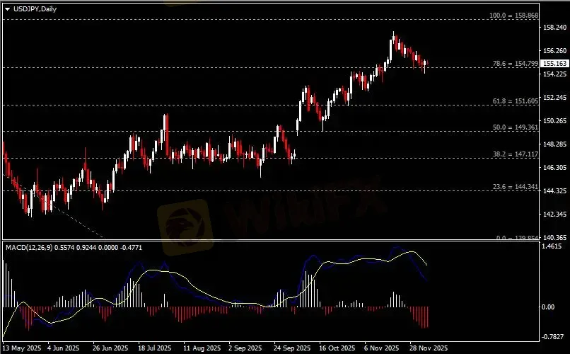 日线图显示美元兑日元企稳收涨于154.80支撑。从MACD来看,快慢线向下运行,红色动能柱则温和收缩。汇价走势基本和动能柱的变化一致。