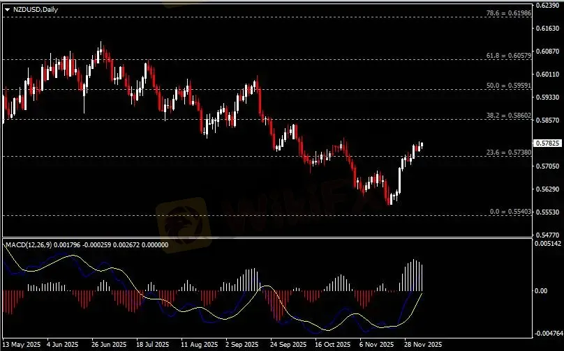 日线图显示纽元兑美元震荡上行,当前收于0.5740支撑。从MACD来看,快慢线向上运行,白色动能柱则温和收缩。汇价走势和动能柱的变化呈分歧。