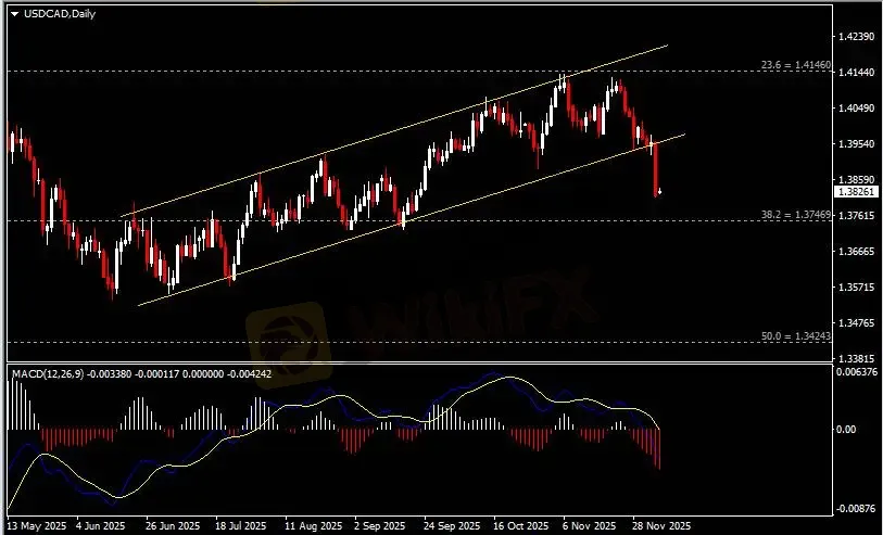 日线图显示美元兑加元急速下挫,当前承压于上行通道底线。从MACD来看,快慢线向下运行,红色动能柱持续放量。汇价走势基本和动能柱的变化一致。