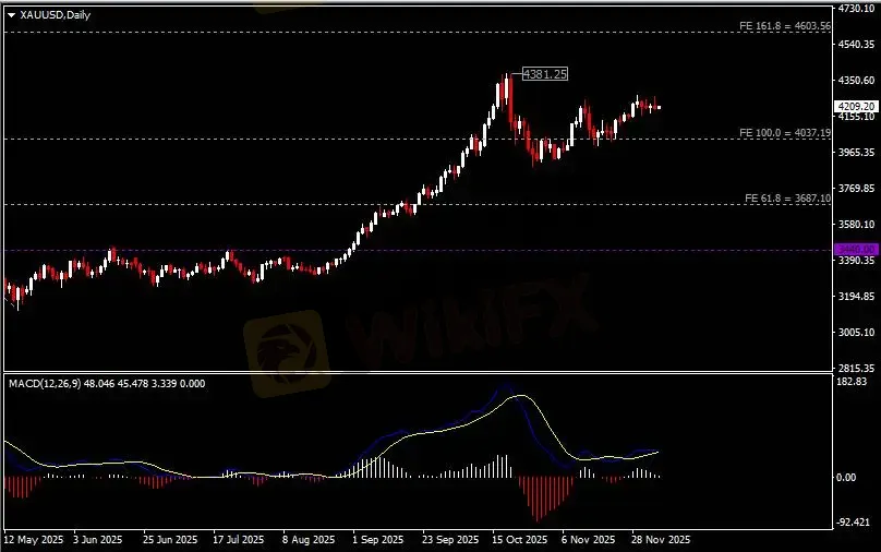 日线图显示金价高位回调,当前仍企稳于4040支撑。从MACD来看,快慢线欲形成死叉,白色动能柱温和收缩。金价走势基本和动能柱的变化一致。