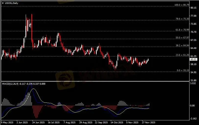 日线图显示油价震荡上行,当前仍承压于61.20阻力。从MACD来看,快慢线向上运行,白色动能柱温和增量。油价走势基本和动能柱的变化一致。