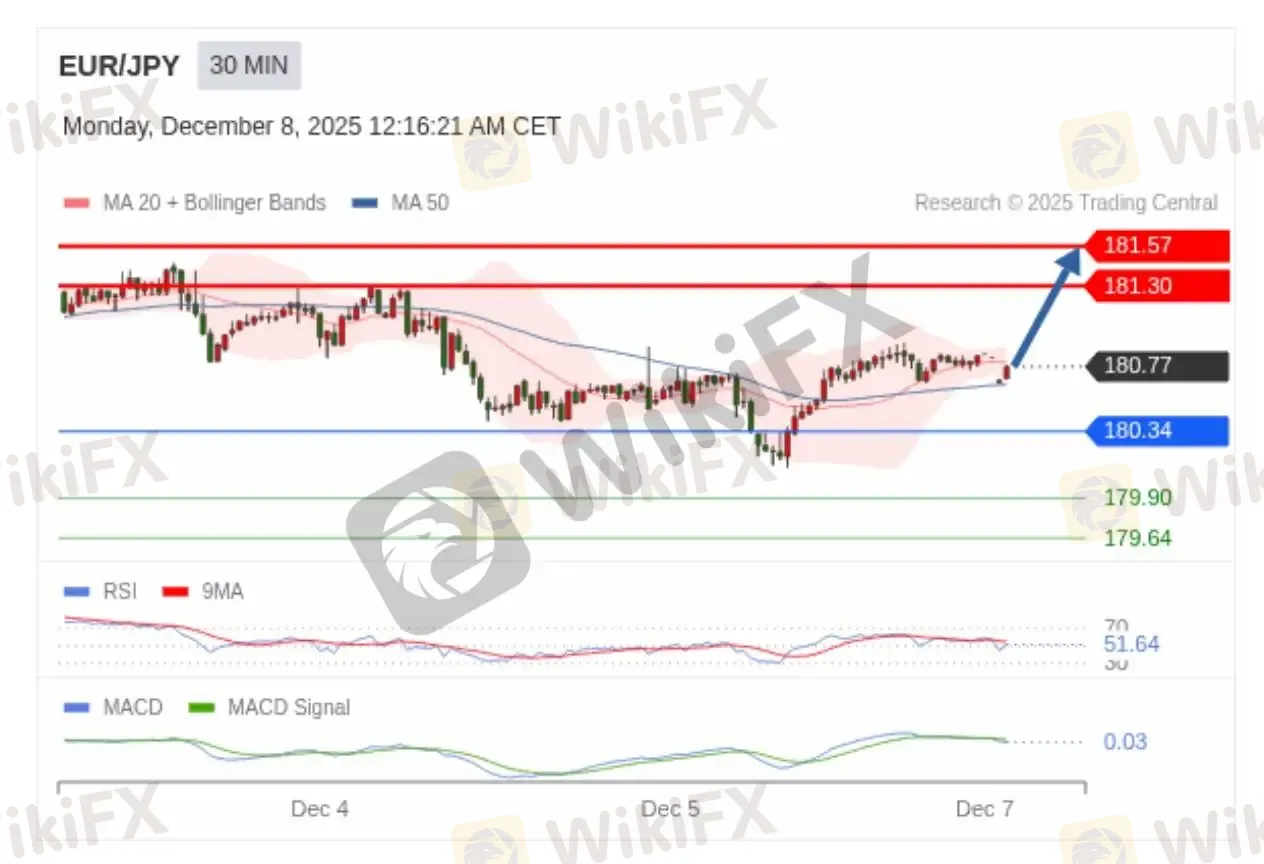 欧元/日元 当日内 : 看涨,当 180.34 为支撑位,目标定在181.57。