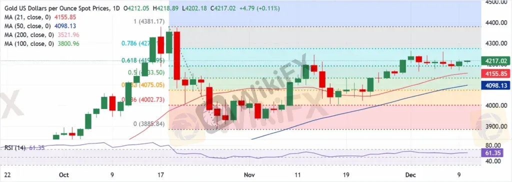 在日线图上,XAU/USD 交易于 $4,217.02。21 日均线升至 50 日、100 日和 200 日均线上方,彰显看涨排列。所有均线都倾斜走高,价格保持在其上方,21 日均线 $4,155.85 为附近提供了动态支撑。RSI 位于 61,表明势头强劲,但未出现超买情况。