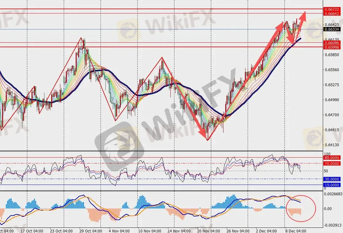 技术面:澳元兑美元H4级别高位盘整,并依旧在48日多空分界线上方运行。另一方面,MACD双线和量能柱在零轴上方扩张。澳洲联储在接下来的几个月将采取以数据为导向的观望政策。