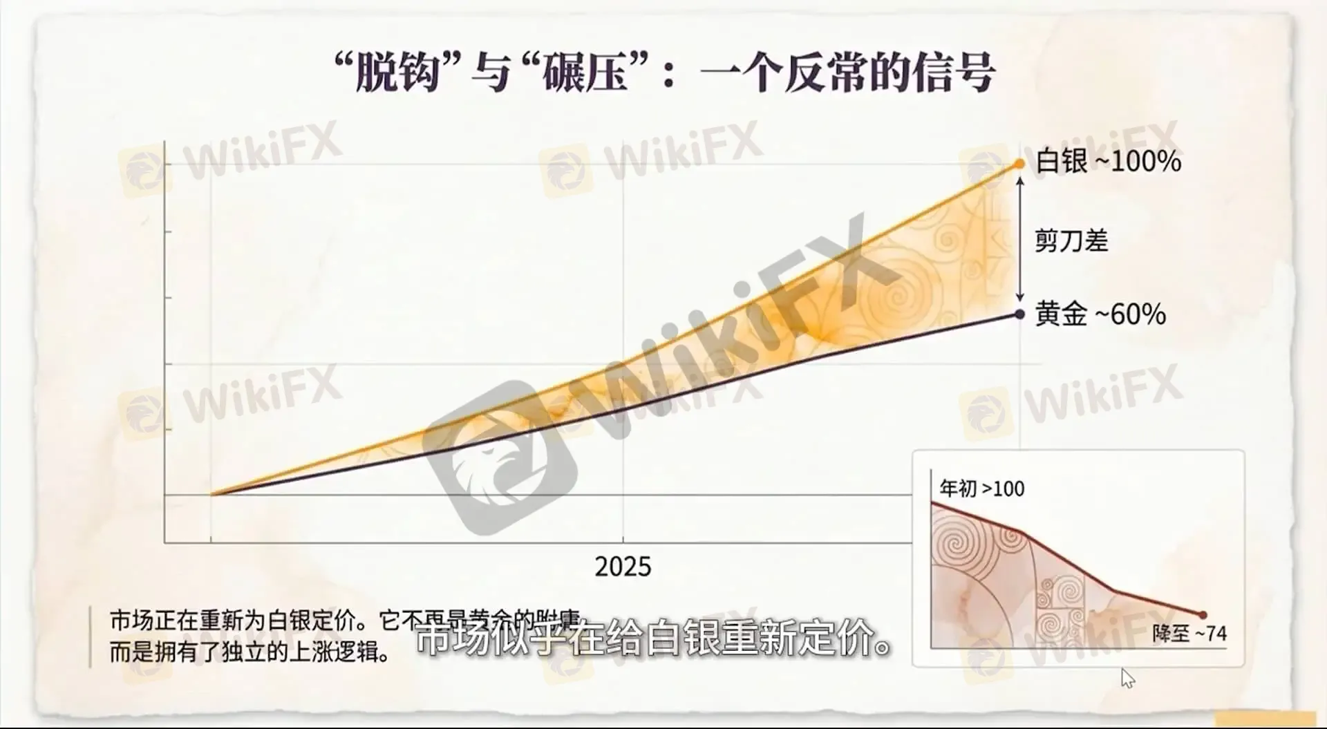 曾星表示,金银比很好体现了市场情绪的变化。在2025年初时,金银比在100以上,但是到了12月下降至74,说明市场正在给白银重新定价。