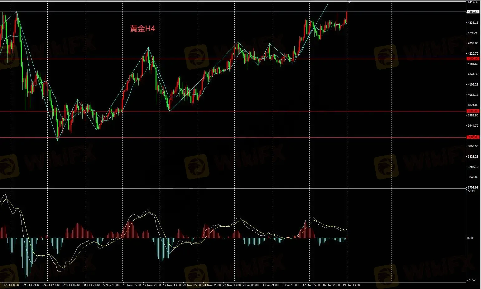 H4图表金价只要维持在4300关口上方则持续维持多头思路;目标历史高点4400及4450。