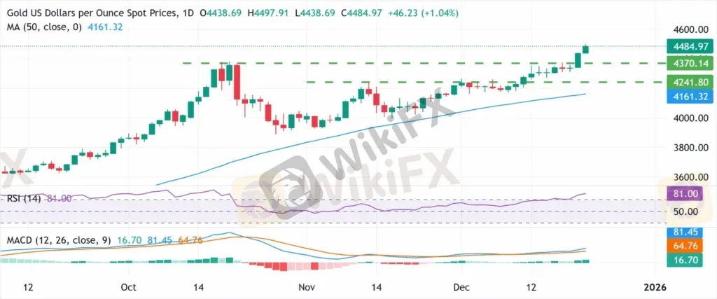 隔夜突破 $4,375-4,380关口(前期历史最高点)并随后突破 $4,400关口,被视为 XAU/美元多头的新触发点。50 日均线稳步攀升,进一步彰显了坚挺的上升趋势。价格维持在均线上方,目前位于 $4,160 附近,这应成为动态支撑。MACD 线延伸至信号线上方,位于正区域,表明看涨势头增强。不过,RSI 指数为 81(超买),可能会限制涨幅,促使近期暂停。