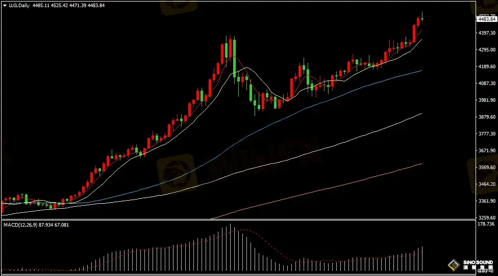 金价日线图看,近三日金价持续创历史新高,今日早盘金价历史性突破4500美元关口上方,最高在4525美元,但随后回落最低至4471美元附近,短线看,金价4500美元关口附近存在激烈争夺。日线指标看,5日与10日均线维持多头排列,MACD指标正动能柱持续增加,RSI指标在超买线上方80位置附近运行。