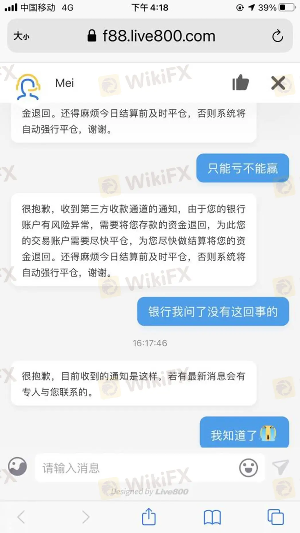 近期一位用户在外汇天眼曝光巨象金业平台,该用户在巨象金业交易一段时间并有不少盈利,但当用户提交出金时却遭到拒绝。随后平台客服要求该用户将持仓全部平仓,给的理由是:“收到第三方收款通道的通知,由于您的银行账户有风险异常,需要将您存款的资金退回。” (下面截图显示的网址对应的正是巨象金业在线客服链接)