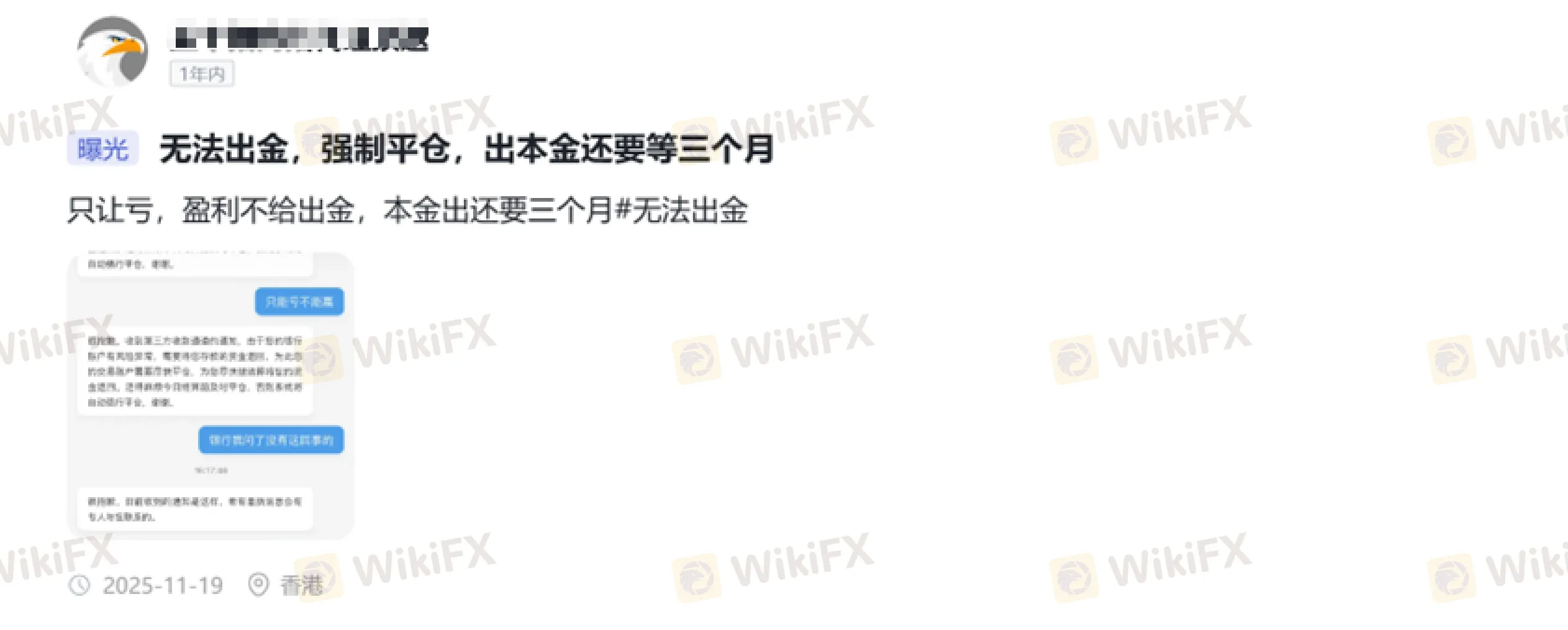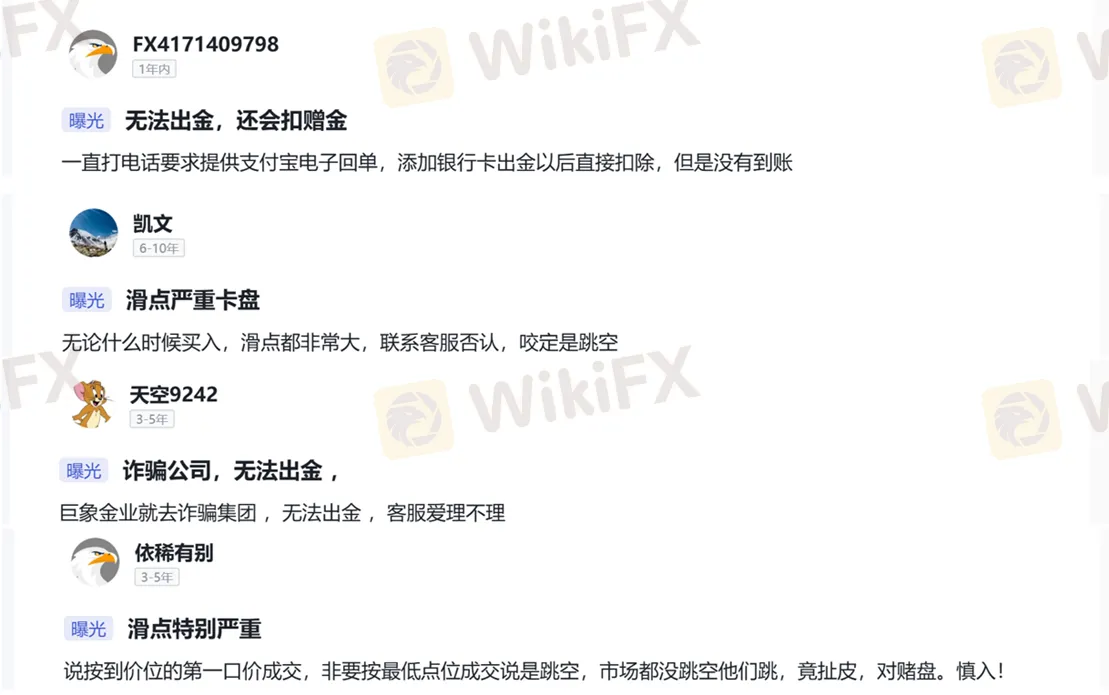 当前距离用户曝光不足三个月,尚不清楚三个月后该用户能不能拿到自己的本金。但参考外汇天眼上的其它用户曝光情况,这可能是拖延的借口。(2025年用户曝光巨象金业最多的两个问题分别是无法出金和滑点。)