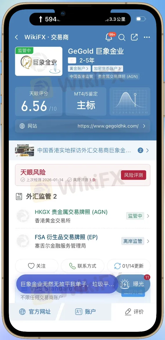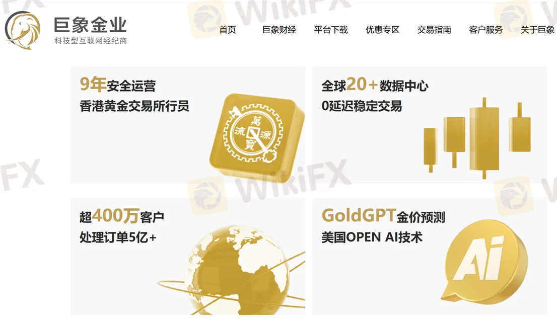 巨象金业背后实体公司为巨象金業有限公司,是香港黄金交易所(HKGX)117号行员,持AA类牌照。网站宣传的安全运营9年,对应该公司成立9年,是否安全运营另说。