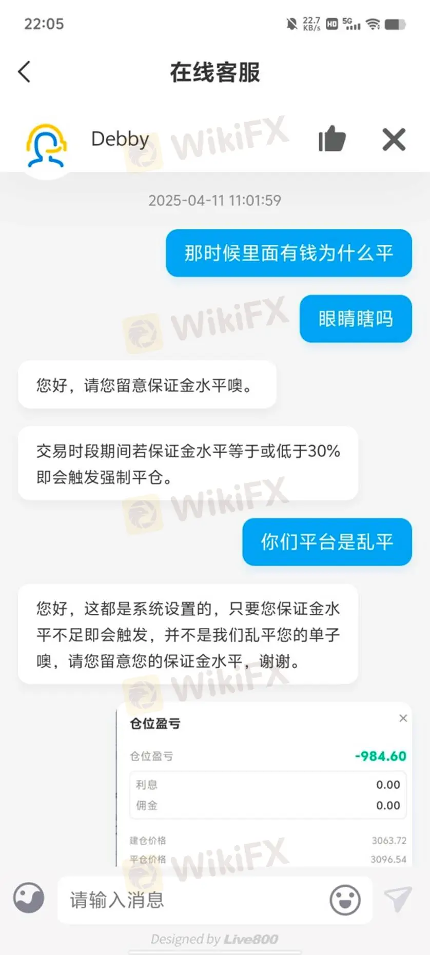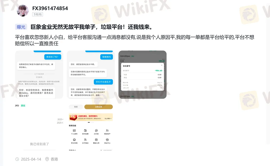 去年4月,一位用户称在巨象金业“我的每一单都是平台给平的”,客服对此的回应是“交易时段期间若保证金水平等于或低于30%即会触发强制平仓”。
