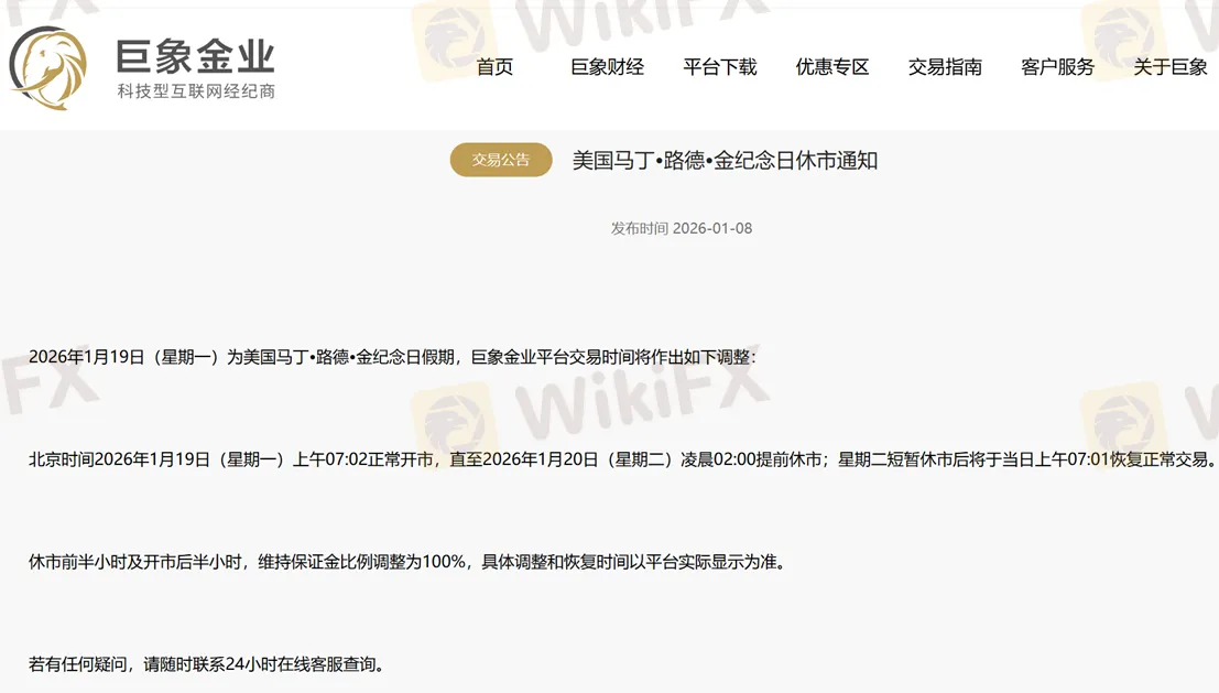 巨象金业官方网站最近的一则公告是关于休市通知的,公告提到“休市前半小时及开市后半小时,维持保证金比例调整为100%,具体调整和恢复时间以平台实际显示为准。”