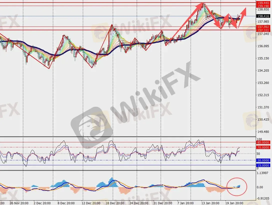 技术面:美元兑日元H4级别震荡反弹,并在48日多空分界线附近运行。另一方面,MACD双线和量能柱在零轴附近扩张。市场普遍预期日本央行在去年12月上调基准利率后,将于周五维持利率不变。
