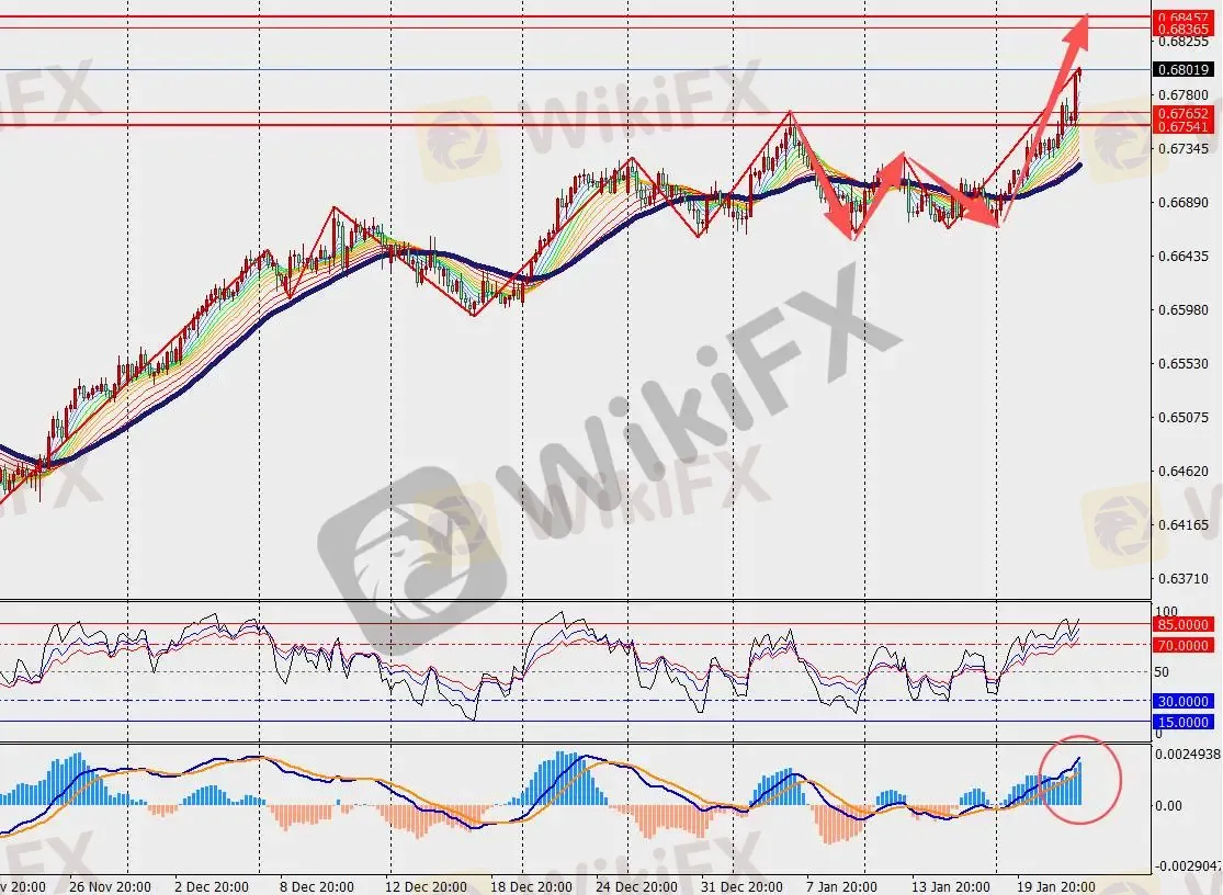 技术面:澳元兑美元H4级别持续上涨,并在48日多空分界线上方运行。此外,MACD双线和量能柱在零轴上方扩张。这份超出预期的12月就业报告强化了市场猜测,即澳大利亚储备银行可能会在下个月出于对劳动力市场仍然过紧的担忧而加息。