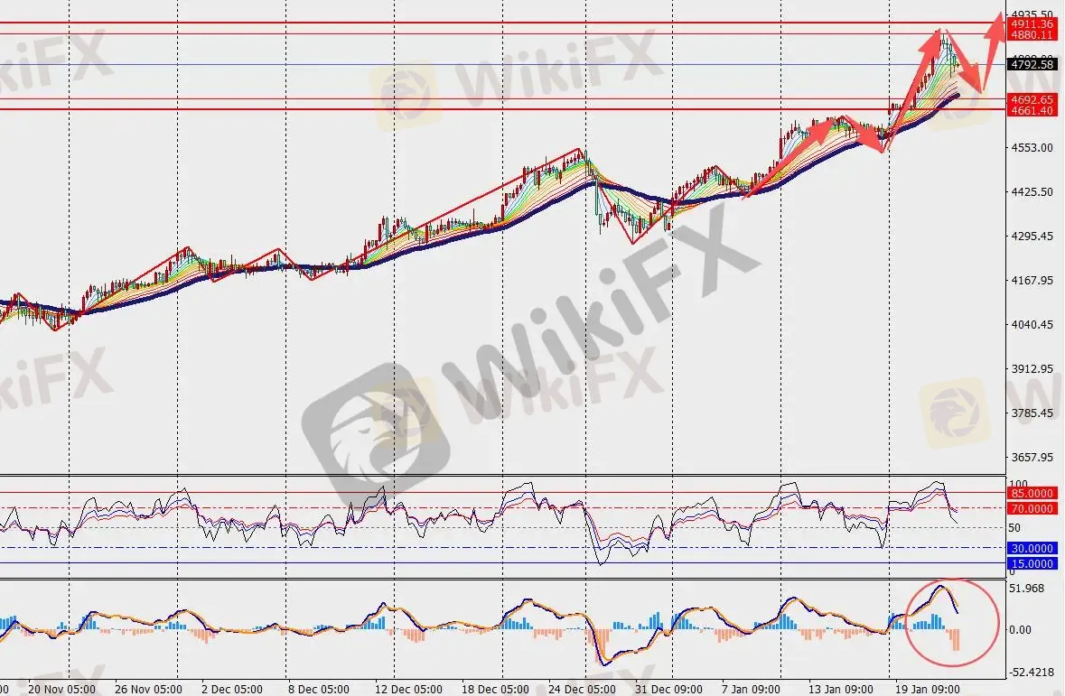 技术面:黄金H4级别遇阻回落,但依旧在48日多空分界线上方运行。此外,MACD双线和量能柱在零轴上方扩张。在一个饱受经济和政治影响困扰的世界里,黄金能够防范损失,这种保险价值可能有助于黄金测试并维持在5000美元这一关键价格水平。