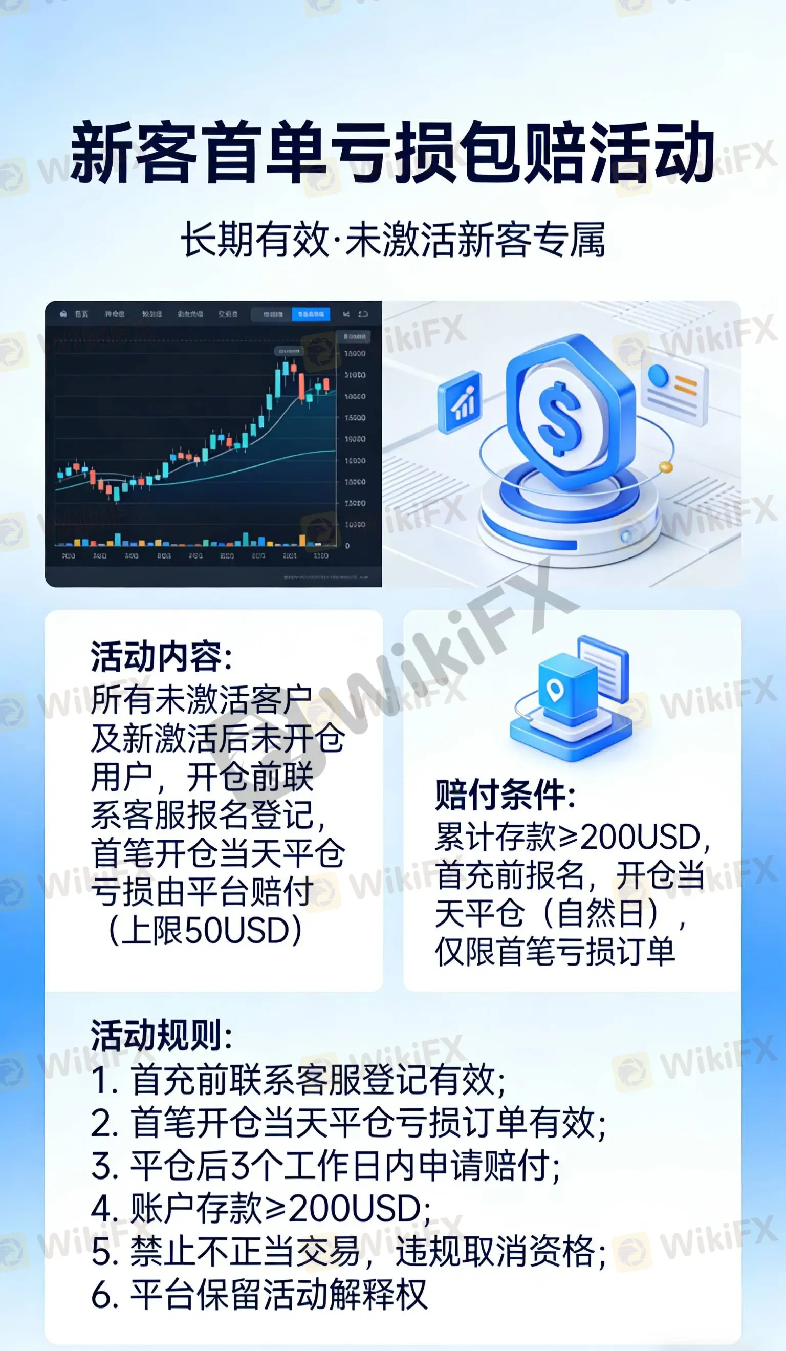 ⚠️ 活动须知:需累计存款满 200USD,首充激活前报名,首笔订单当日完成平仓且产生亏损可申请赔付,平仓后 3 个工作日内联系客服申领。