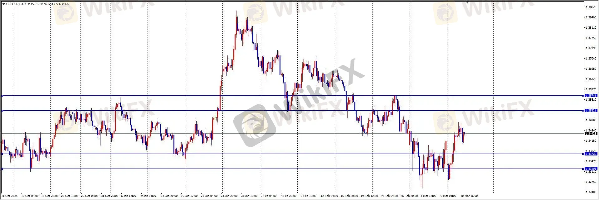 周二,英镑兑美元价格波动加剧。中东局势缓和带动油价从高位回落,缓解了市场对英国输入性通胀的担忧。同时,英国疲软的就业市场和放缓的工资增长数据,限制了通胀上行压力,市场继续预期英国央行将在年内进行降息。美元方面,虽然地缘冲突不确定性持续,但油价暴跌暂时减轻了美元的买盘支撑。镑美价格在触及 1.3447 附近后回落整理,最终日线收出一根带上影线的阴线,日内波幅约 74 点。