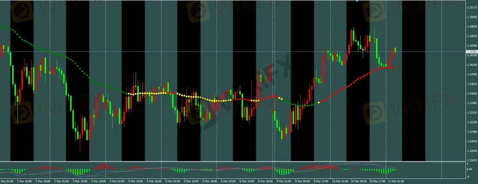当前 H1 三色线维持红色。按照 H1 交易模型,在 1.341 附近入场的多单已生效,建议将保护性止损设于 1.334 附近,目标看向开仓位上方 60 点。若三色线转为绿色,则多单应随即平仓。