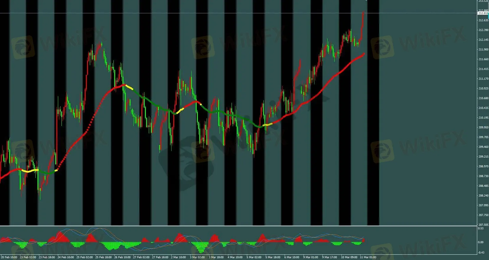 当前 H1 三色线维持红色。此前 H1 标准多单在 210.3 附近入场,并已顺利到达 70 点盈利目标出场。日内短线交易建议根据 M5 基础模型进行操作。