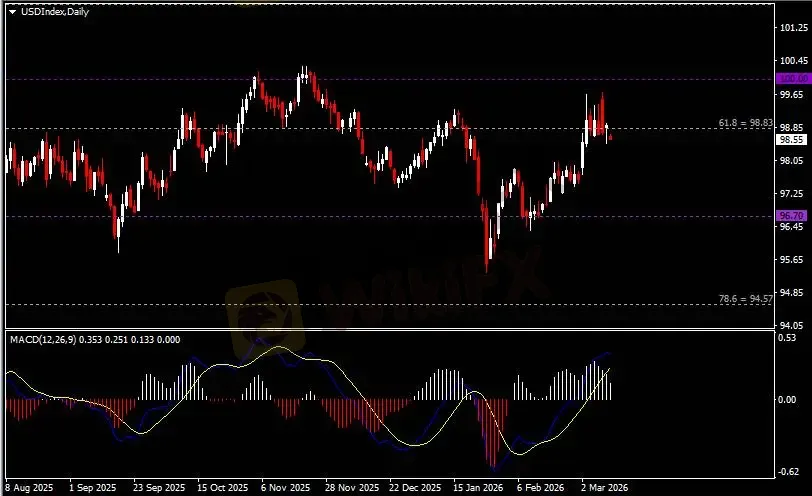 日线图显示美元指数回调暂缓,当前持续测试98.80支撑。从MACD来看,快慢线呈拐向,白色动能柱温和收缩。指数走势和动能柱的变化呈分歧。