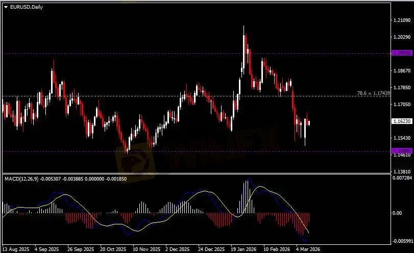 日线图显示欧元兑美元小幅回落,当前仍收于1.1480支撑。从MACD来看,快慢线呈拐向,红色动能柱温和收缩。汇价走势和动能柱的变化呈分歧。