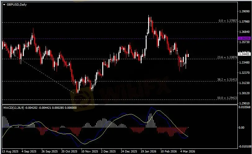 日线图显示英镑兑美元回调下跌,当前收于1.3390支撑。从MACD来看,快慢线形成金叉,红色动能柱收缩殆尽。汇价走势和动能柱的变化呈分歧。