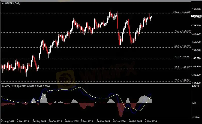 日线图显示美元兑日元震荡上行,当前仍承压于158.90阻力。从MACD来看,快慢线向上运行,白色动能柱则温和收缩。汇价走势和动能柱的变化呈分歧。