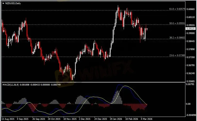 日线图显示纽元兑美元小幅承压于0.5960阻力。从MACD来看,快慢线呈拐向,红色动能柱温和收缩。汇价走势和动能柱的变化呈分歧。