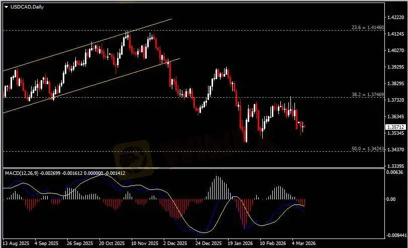 日线图显示美元兑加元波幅有限,当前仍承压于1.3750阻力。从MACD来看,快慢线向下运行,红色动能柱温和放量。汇价走势基本和动能柱的变化一致。