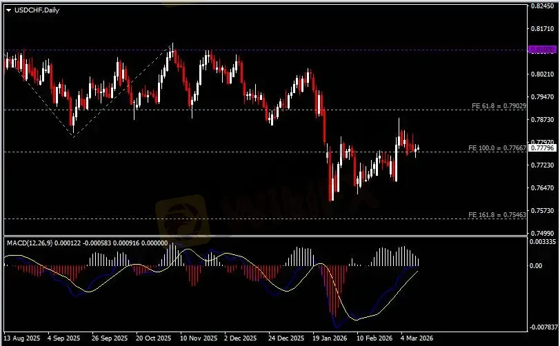 日线图显示美元兑瑞郎小幅收涨于0.7770支撑。从MACD来看,快慢线略呈拐向,白色动能柱温和收缩。汇价走势和动能柱的变化呈分歧。